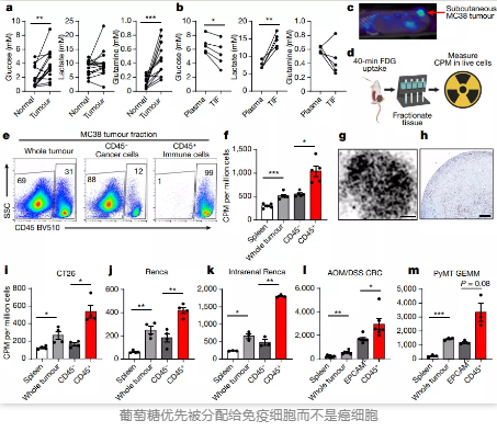 在这项试验中,研究人员首先使用18F-FDG PET探测了结直肠癌、肾癌和乳腺癌等不同肿瘤小鼠模型中的葡萄糖消耗情况,从而量化肿瘤微环境中不同细胞群对葡萄糖的摄入。结果令人惊讶,葡萄糖优先被分配给了浸润性免疫细胞,而非癌细胞。