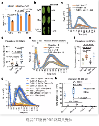 首先研究人员使用拟南芥作为研究对象,结果表明PRR及其共受体在ETI过程中发挥重要作用。 在fls2 efr cerk1 (fec) 和bak1 bkk1 cerk1 (bbc)突变体(缺乏PRR及其共受体的主要成分)中,Pst DC3000(AvrRpt2)不能触发有效的ETI响应,表明PRR 及其共受体是诱发ETI所必需的。