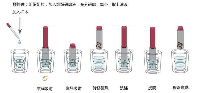 用于提取组织样本中RNA,试剂盒是有效吸附核酸的超顺磁性纳米微球和提取试剂体系组成,产品不含苯酚,氯仿等有害试剂,经过独特的表面修饰的磁珠,结合核酸能力更强、洗脱更容易;操作步骤简单,操作时间短,室温提取过程,适合于快速核酸提取的磁珠自动化过程。